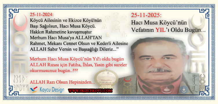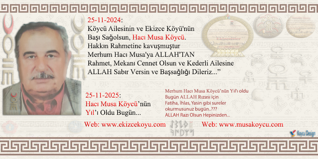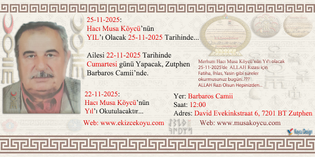 “25-11-2024: Köycü Ailesinin, Muğulcalı-Muscalı-Musacalı Kabilesinin, Ekizce Köyü'nün ve Zutphen Halkının Başı Sağolsun, Hacı Musa Köycü. Hakkın Rahmetine kavuşmuştur Merhum Hacı Musa'ya ALLAH'TAN Rahmet, Mekanı Cennet Olsun ve Kederli Ailesine ALLAH Sabır Versin ve Başsağlığı Dileriz...”